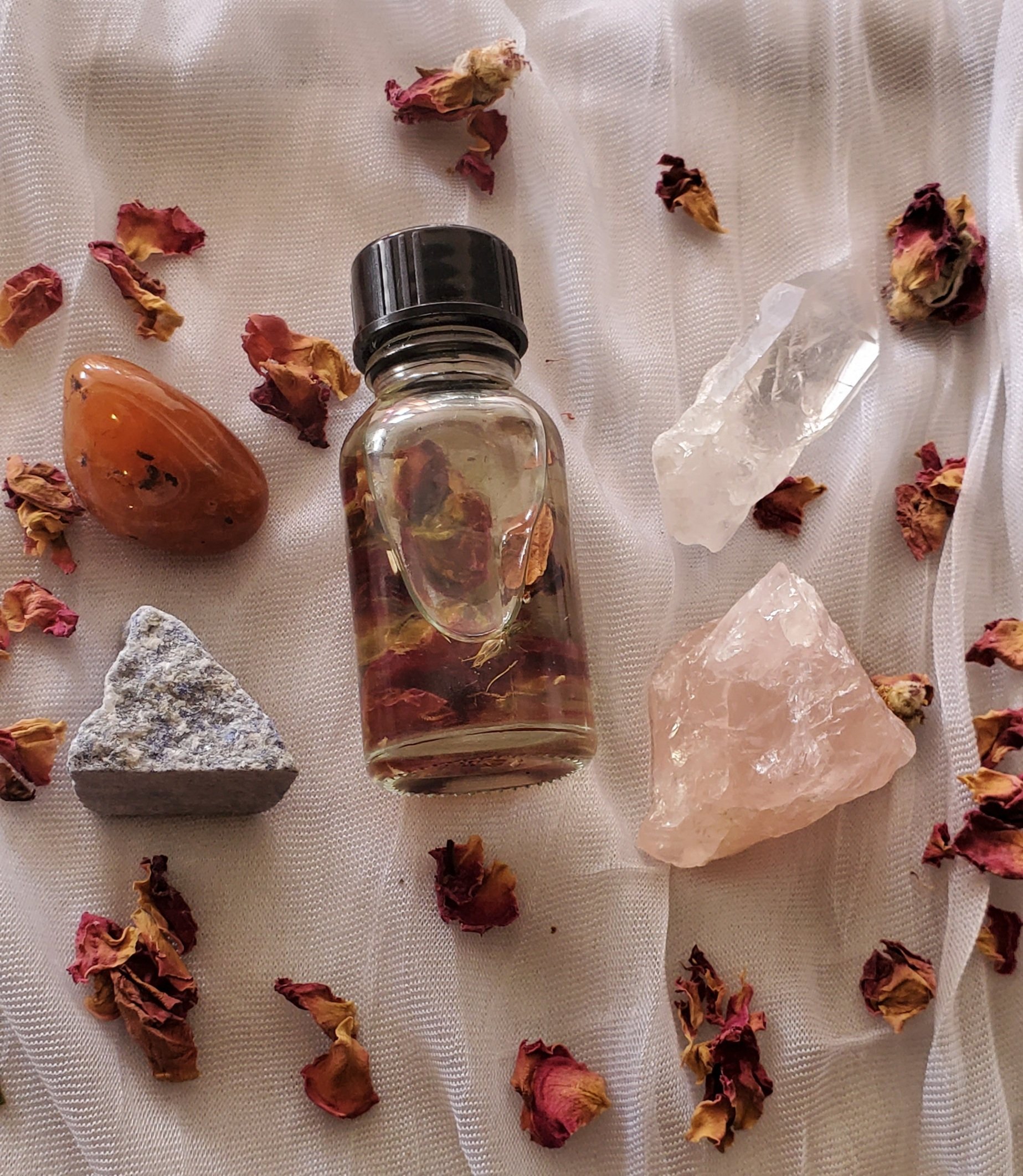 My handmade oil is made with almond or grapeseed oil (specify allergy) rose petals, catnip, jezebel root and rosemary. Conjured with seduction and romance vibes, use this to bring possible suitors or to spice up your love life