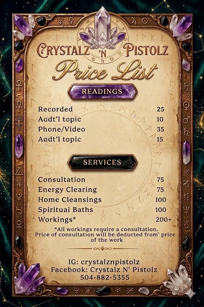 Full Reading includes 4 questions/topics or one each of General, Love, Finance/Career, and Spiritual Journey 5-card spreads and clarifiers as needed.